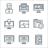Zdjęcie "ikony linii rozwoju stron internetowych. zestaw liniowy. zestaw linii wektorowych jakości, takich jak mapa strony, logowanie, konserwacja, wytyczne, alert, front end, strona internetowa, kodowanie" może być wykorzystywane do celów osobistych i komercyjnych zgodnie z warunkami zakupionej licencji Royalty-free. Obraz jest dostępny do pobrania w jakości wysokiej rozdzielczości do 5760x3840.