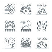 ikony przyrody i krajobrazu. zestaw liniowy. zestaw linii wektorowych jakości, takich jak drzewo, pola, góry