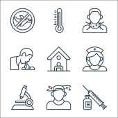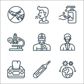 ikony linii koronawirusów. zestaw liniowy. wysokiej jakości zestaw linii wektorowych, takich jak gorączka, szkło powiększające, środek dezynfekujący