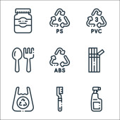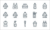 ikony linii produktów z tworzyw sztucznych. zestaw liniowy. wysokiej jakości zestaw linii wektorowych, takich jak konewka, naczynia, recykling