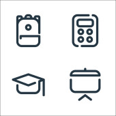 ikony linii materiałów edukacyjnych. zestaw liniowy. wysokiej jakości zestaw linii wektorowych, takich jak autobus szkolny, kalkulator, notebook