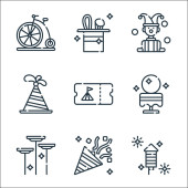 ikony linii cyrkowej. zestaw liniowy. wysokiej jakości zestaw linii wektorowych, takich jak, koło, fajerwerki, słoń, niedźwiedź, cyrk, pierścień ognia, dekoracja, bilet