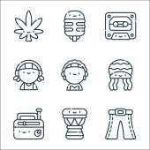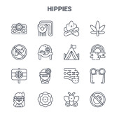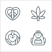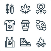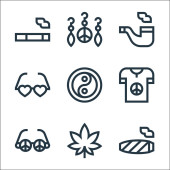 Ikony hipisów. zestaw liniowy. wysokiej jakości zestaw linii wektorowych, takich jak motyl, marihuana, pióro
