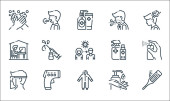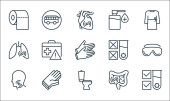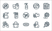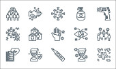 ikony rozprzestrzeniania się wirusa. zestaw liniowy. wysokiej jakości zestaw linii wektorowych, takich jak termometr, termometr, osoba, płuca, koronawirus, okulary, alkohol, oko, maska