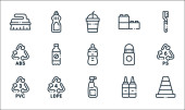 ikony linii produktów z tworzyw sztucznych. zestaw liniowy. wysokiej jakości zestaw linii wektorowych, takich jak szczotka do czyszczenia, recykling, kubek pomiarowy, butelka mydła, recykling, wiadro wody, kanister na ubrania, recykling