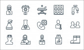 ikony linii produktów z tworzyw sztucznych. zestaw liniowy. wysokiej jakości zestaw linii wektorowych, takich jak zabawki, wieszak na ubrania, pojemnik na żywność, butelka mydła, butelka wody, patelnia, recykling, zabawka samochodowa, recykling