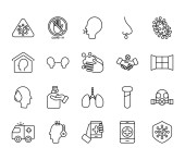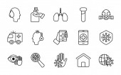 ikony linii koronawirusów. zestaw liniowy. wysokiej jakości zestaw linii wektorowych, takich jak termometr, bez lotu, bezpieczeństwo, probówka, gorączka, radiowóz, bicie serca, pielęgniarka, naukowiec