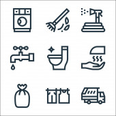 ikony linii mebli domowych. zestaw liniowy. wysokiej jakości zestaw linii wektorowych, takich jak podwójne łóżko, stół biurowy, szafa, łóżko pojedyncze, biurko, kran, pralka, latarka