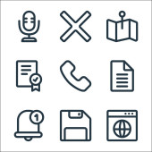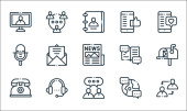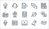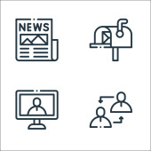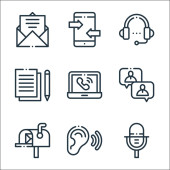 ikony linii komunikacyjnych. zestaw liniowy. wysokiej jakości zestaw linii wektorowych, takich jak zapis, mikrofon, słuchawki, gazeta, satelita, domofon, wiadomość, telefon