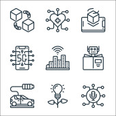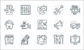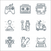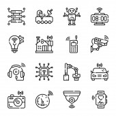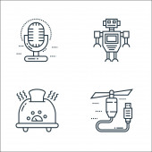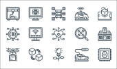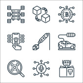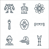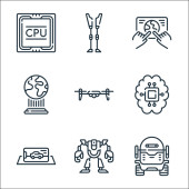 technologia przyszłych ikon linii. zestaw liniowy. wysokiej jakości zestaw linii wektorowych, takich jak dźwig, cpu, d drukarki, kopuła, robot, smarthome, autonomiczny samochód, cyborg