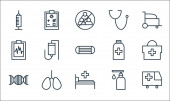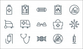 ikony linii wirusów. zestaw liniowy. wysokiej jakości zestaw linii wektorowych, takich jak tabletki, kwarantanna, mydło, badanie krwi, butelka tabletek, szpital, wykres wzrostu, karetka, łóżko szpitalne