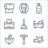 Zdjęcie "ikony linii czyszczącej. zestaw liniowy. wysokiej jakości zestaw linii wektorowych, takich jak gąbka, szczotka, kuchenka mikrofalowa, fartuch, kranu wody, wieszak na ubrania, mydło, grabie" może być wykorzystywane do celów osobistych i komercyjnych zgodnie z warunkami zakupionej licencji Royalty-free. Obraz jest dostępny do pobrania w jakości wysokiej rozdzielczości do 5760x3840.