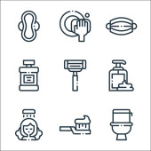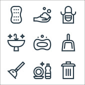 ikony linii czyszczącej. zestaw liniowy. wysokiej jakości zestaw linii wektorowych, takich jak gąbka, szczotka, kuchenka mikrofalowa, fartuch, kranu wody, wieszak na ubrania, mydło, grabie