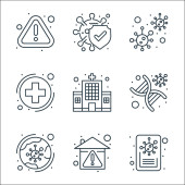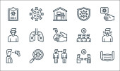 ikony nowego wirusa pandemii. zestaw liniowy. wysokiej jakości zestaw linii wektorowych, takich jak pobyt w domu, tarcza krzyżowa, układ odpornościowy, lekarz, koronawirus, budynek szpitala, ostrzeżenie przed wirusami, maska