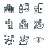 ikony linii artykułów medycznych. zestaw liniowy. wysokiej jakości zestaw linii wektorowych, takich jak sypialnia, książka medyczna, tkanka, bez leków, DNA, projektor, kardiogram, dezynfektor dłoni