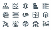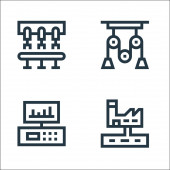 ikony linii produkcyjnych. zestaw liniowy. wysokiej jakości zestaw linii wektorowych, takich jak wciągarka, dźwignia sterująca, fabryka, produkcja, przenośnik taśmowy, niebezpieczeństwo, produkcja, piła