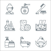 ikony linii czyszczącej. zestaw liniowy. wysokiej jakości zestaw linii wektorowych, takich jak kosz na śmieci, mycie, tłok, patelnia, mydło, czyste, fartuch, mycie rąk