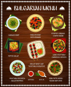 Kuchnia bułgarska wektorowe wzornictwo menu restauracji szablon. Sałatki warzywne, kebapche mięsne i ser bryndza, opiekacz do zupy jogurtowej, pieprz chutney lutenitsa, bułki kapusty, placki owocowe i ciasta