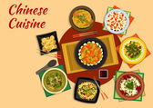 Kuchnia chińska z wektorowe dania kuchni azjatyckiej z owoców morza i makaronu mięsnego, gotowane na parze ryby i bułki bao, warzywa z sosem ostrygowym. Zupa grzybowa, krewetki szechuańskie, ciasteczka ananasowe i mleko smażone