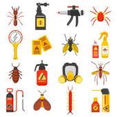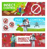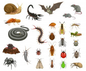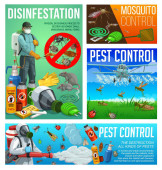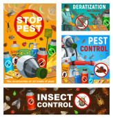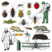 Zwalczanie szkodników wektor zestaw kreskówki z owadów szkodników, robaki i gryzonie, tępiciele, pestycydy i samolot. Rozpylacz owadobójczy, komar, karaluch i mucha, mysz, szczur, osa i pchła, biedronka i mszyca