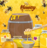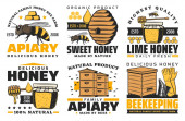 Miód, pszczoła, rój i pszczelarze chorągiewki, wektorowe pszczelarskie jedzenie. Plaster miodu, pszczoły, pasieki, kwiaty i słoiki miodu, żółty pyłek, dymka i palacz, pszczelarstwo lub pszczelarstwo projekt