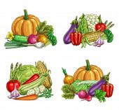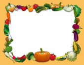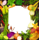 Rama wektor warzywa z gospodarstwa i ogród świeże jedzenie. Pieprz, marchew, pomidor i czosnek, rzodkiew, cebula, kapusta i szparagi, brokuły, kalafior, bakłażan i dynia, groszek i kukurydza granicy
