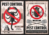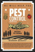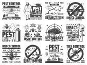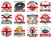 Kontrola szkodników i usługi dezynfekcji izolowane ikony wektorowe z owadów i insektycydów. Komar, pająk, ćma i wąż, chrząszcz i srebrzyste ryby z czerwonymi zakazanymi symbolami, rozpylacze odstraszające i cewki