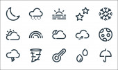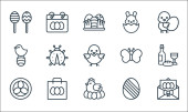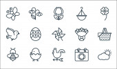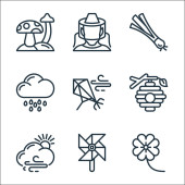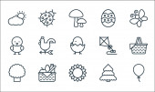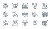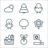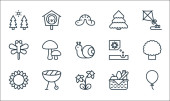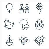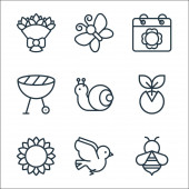 ikony płaskiej linii sprężyny. zestaw liniowy. wysokiej jakości zestaw linii wektorowych, takich jak biedronka, grzyby, parasol, kalendarz, chmury i słońce, słonecznik, kiełek, drzewo, drzewo