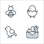 ikony płaskiej linii sprężyny. zestaw liniowy. wysokiej jakości zestaw linii wektorowych, takich jak robak, ptak, biedronka, tulipan, pinwheel, koniczyna, pisklę, koszyk żywności