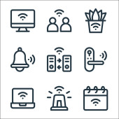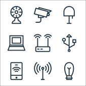 Internet rzeczy ikony linii. zestaw liniowy. wysokiej jakości zestaw linii wektorowych, takich jak laptop, lokalizacja, inteligentny dron, transfer danych, inteligentne drzwi, dzwonek, inteligentny piekarnik, cctv