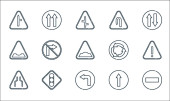 ikony linii sygnalizacyjnych. zestaw liniowy. wysokiej jakości zestaw linii wektorowych, takich jak prawy zakręt wsteczny, wąska droga, kierunek, dwukierunkowy, wydajność, nachylenie, lewy pin włosów, garb, skrzyżowanie dróg