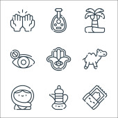 ikony linii Ramadan. zestaw liniowy. zestaw linii wektorowych jakości, takich jak wielbłąd, kalendarz, hamsa