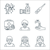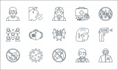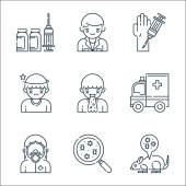 ikony linii przesyłu wirusa. zestaw liniowy. wysokiej jakości zestaw linii wektorowych, takich jak wstrzyknięcie, karetka, płuco, lek, pielęgniarka, hazmat, wyszukiwanie, lekarz