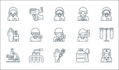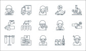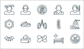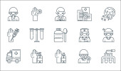 ikony linii przesyłu wirusa. zestaw liniowy. wysokiej jakości zestaw linii wektorowych, takich jak mycie, wstrzykiwanie, wyszukiwanie, dezynfekcja rąk, przenoszenie wirusa, medycyna, zawroty głowy, szpital, karetka