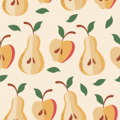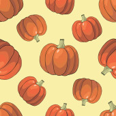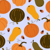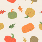 Jesienny bezszwowy wzór na beżowym tle. Ciepła kolorystyka. Kolorowe dojrzałe dynie. Ilustracja wektora.