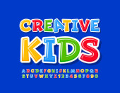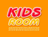 Znak wektorowy Kids Studio z dekoracyjnym motylem. Odręcznie napisany jasny Font. Kolorowe litery i liczby alfabetu