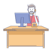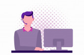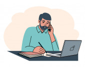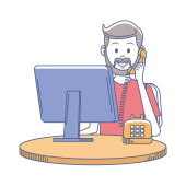 Zdjęcie "Ludzie Komunikacja i rozmowa z postaciami wektorowymi telefonu. Młody człowiek Ilustracja rozmowy telefonicznej. Biznesmen pracujący w miejscu pracy. Młody człowiek pracuje przy komputerze. ilustracja wektora" może być wykorzystywane do celów osobistych i komercyjnych zgodnie z warunkami zakupionej licencji Royalty-free. Obraz jest dostępny do pobrania w jakości wysokiej rozdzielczości do 5760x3840.