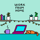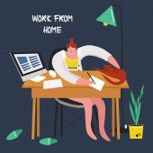 Przytulne miejsce pracy w domu. Kobieta pracuje w domu. Student uczy się online. Praca zdalna, nauka, kursy. Spotkanie lub lekcja online, wideokonferencja, transmisja na żywo. Żyroskop płaski.