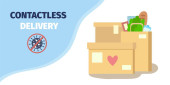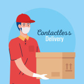 Dostawa Chłopiec produkty spożywcze torba wprowadzenie w pobliżu bezkontaktowy klient w drzwiach na niebieskim tle Unikaj Coronavirus.