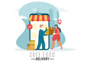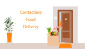 Kurier Boy Informuje Cię o zamówieniu Dostawa z telefonu do kobiety stojącej przy drzwiach dla dostawy żywności bezkontaktowej.