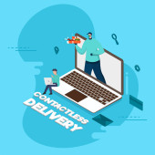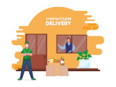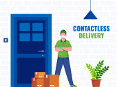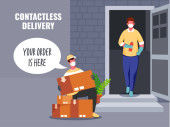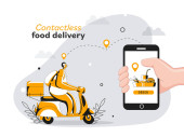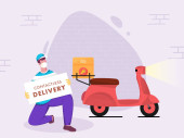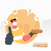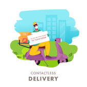 Pizza Kurier Man siedzi na skuterze z Holding Message Board of Contactless Delivery During Coronavirus (Covid-19) for Advertising Concept.