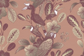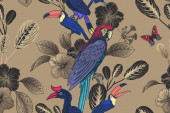 Zdjęcie "Tropikalny wzór kwiatowy bez szwu. Czarno-białe tło dla tekstyliów, papieru, tapety. Tropikalne liście i kwiaty hibiskus, ptaki papugi i tukany, ananasy. Egzotyczny wzór. Wektor. Winobranie" może być wykorzystywane do celów osobistych i komercyjnych zgodnie z warunkami zakupionej licencji Royalty-free. Obraz jest dostępny do pobrania w jakości wysokiej rozdzielczości do 5760x3840.