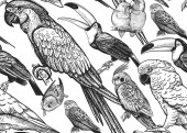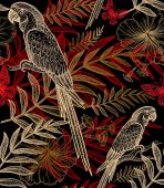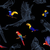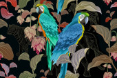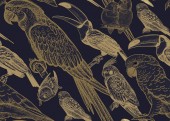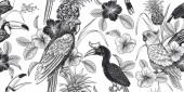 Ptaki tropikalne, kwiaty, owoce, liście na czarnym tle. Kwiatowy bezszwowy wzór. Ananas, papugi, tukany. Egzotyczna natura. Ilustracja wektora. Klasyka. Luksusowy letni design dla hawajskich koszul