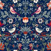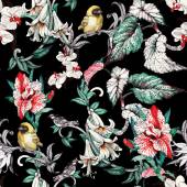Tropikalny wzór kwiatowy bez szwu. Jasne tropikalne ptaki, kwiaty, owoce, złote liście na czarnym tle. Egzotyczna natura. Ilustracja wektora. Klasyka. Luksusowy letni design dla hawajskich koszul.
