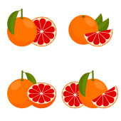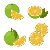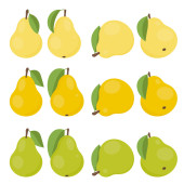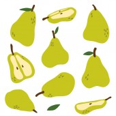 Gruszki z liśćmi pod różnymi kątami. Zestaw kolorowych ikon. Ilustracja wektora.