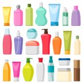 Półka z kosmetykami: szampony, płyny, mydło w płynie i pasta do zębów. Sklep. Wektor płaska ilustracja. Płynne tło. Wzór.