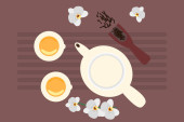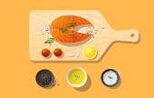 Grillowana ryba z warzywami. Tradycyjne śródziemnomorskie danie na ciemnym drewnianym tle z pomidorami, ziołami i przyprawami. Ilustracja wektora.