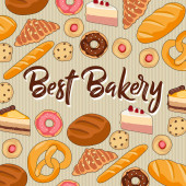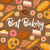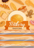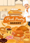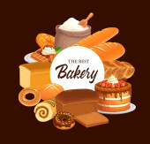 Piekarnia, chleb lub ciasto desery kawiarnia. Wektor słodkie pieczone ciasto, ciasto i naleśniki z croissant, chleb bochenek, worek mąki i babeczka. Bułeczki i asortyment cukierni na plakat kreskówki sklep piekarniczy