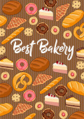 Zdjęcie "Piekarnia, chleb lub ciasto desery kawiarnia. Wektor słodkie pieczone ciasto, ciasto i naleśniki z croissant, chleb bochenek, worek mąki i babeczka. Bułeczki i asortyment cukierni na plakat kreskówki sklep piekarniczy" może być wykorzystywane do celów osobistych i komercyjnych zgodnie z warunkami zakupionej licencji Royalty-free. Obraz jest dostępny do pobrania w jakości wysokiej rozdzielczości do 5760x3840.