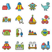kreskówka zabawka rakieta pociąg samochód robot kostka łódź niedźwiedź latawiec, obiekt dla małych dzieci do zabawy, płaski styl ikony zestaw